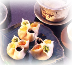 做法:先將胡蘿卜切成小丁,茶葉泡開后切成末;將胡蘿卜丁、茶葉末、青豆、玉米粒用適量鹽、雞精、胡椒粉(根據(jù)自己的喜好決定)、蠔油、白糖、麻油調(diào)味后拌勻;加入少量面粉、鹽和油和成面團(tuán)。最后將和好的面搟成薄皮,包入調(diào)好的餡,做成餃子,上屜蒸5分鐘左右即成。