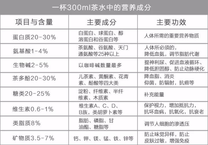 據(jù)科學(xué)家分析和鑒定,茶葉中含有300多種對人體有益的化學(xué)成分。其中包含大量的蛋白質(zhì)、氨基酸、脂肪、碳水化合物、礦物質(zhì)、微量元素以及維生素,其中維生素多達10余種,泡茶時多數(shù)可溶解在水中,能被充分利用。