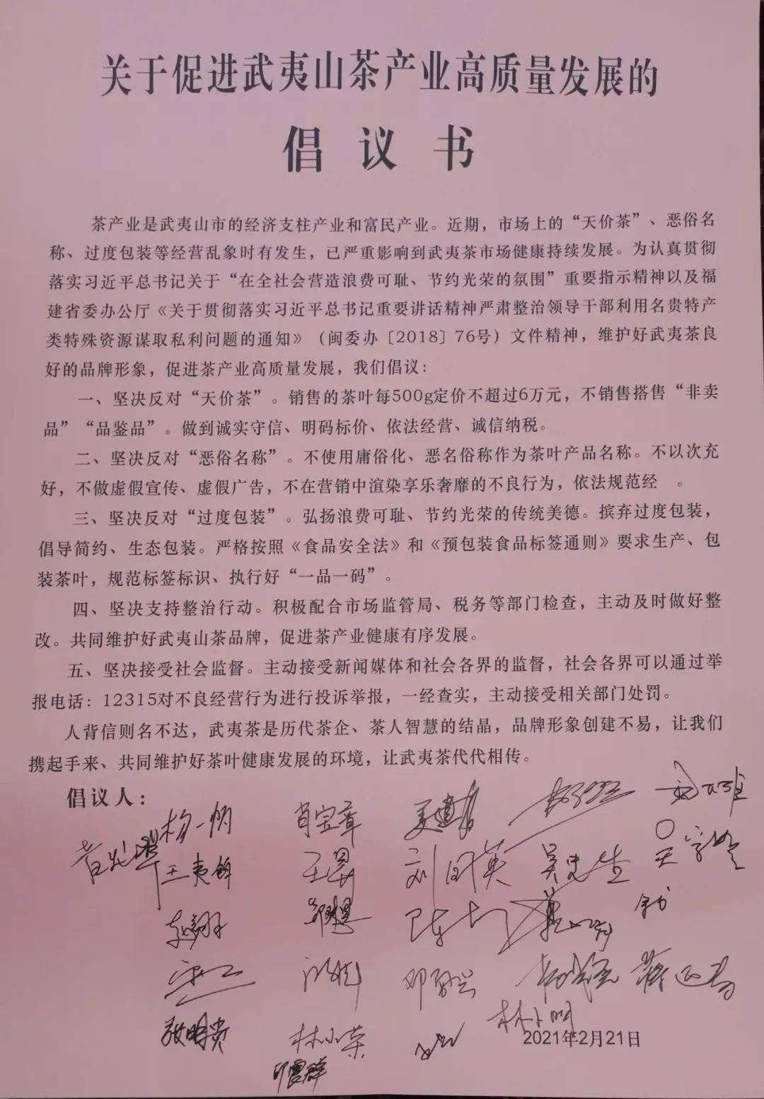 2月21日下午,武夷山市召開促進茶葉市場健康發(fā)展推進會,26家曾出現(xiàn)在網(wǎng)傳“天價茶”榜單上的武夷山茶企負責人共同簽署《關于促進武夷山茶產(chǎn)業(yè)高質量發(fā)展的倡議書》,堅決反對“天價茶”,堅決反對“惡俗名稱”、“過度包裝”,承諾不做虛假宣傳,規(guī)范經(jīng)營管理,不銷售“非賣品”“品鑒品”,自覺接受監(jiān)督,如有違法違規(guī)行為,一經(jīng)查實,主動接受相關部門處罰。