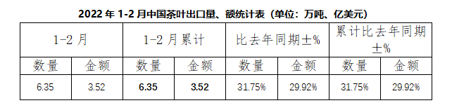 據(jù)中國(guó)海關(guān)數(shù)據(jù),2022年1-2月,中國(guó)茶葉出口量為6.35萬(wàn)噸,同比增長(zhǎng)31.75%,出口額為3.52億美元,同比增長(zhǎng)29.92%,1-2月出口均價(jià)為5.54美元/千克,比去年同期微降1.39%。
